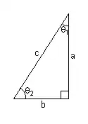 If one considers the diagram representing a right triangle with the two non-right angles θ1and θ2, and the side lengths a,b,c as shown here: