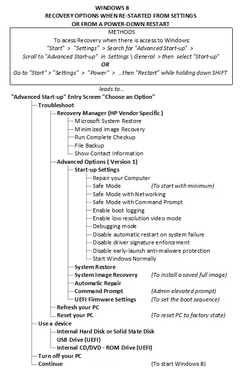- The third drop-box's layout, Specific Recovery Options for Windows 8 takes the same approach as for that of Windows 7. In fact there are more methods shown than for Windows 7. and the three listings here are also in tree format. Notice the change to f11 for the key boot-up, but see the notes in the section below for the use of f8. If laptop viewing of such detail becomes difficult, just click the box contents to view the images in full scale. Use f8 starts in Windows 8.