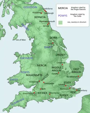 During 632 or 633, Edwin of Northumbria was overthrown and slain and his kingdom was ravaged by Cadwallon ap Cadfan, supported by Penda of Mercia.[12] The Mercians then turned on the East Angles and their king, Ecgric. In 640 or 641, they routed the East Anglian army in a battle in which Ecgric and his predecessor Sigeberht both perished.[13]