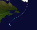 A hybrid-type depression formed east of Bermuda on July 29. It moved rapidly southwestward before turning to a northwest drift. On August 3, it was classified as a tropical depression, and the next day the system passed near Bermuda. The depression accelerated to the northeast, strengthening into a tropical storm on August 5. It intensified further due to baroclinity, or enhanced instability through different levels of the atmosphere caused by temperature and moisture gradients.[8] On August 6, a drilling rig about 230 mi (370 km) southeast of Newfoundland recorded sustained winds of 90 mph (140 km/h) with gusts to 126 mph (204 km/h) at an altitude of 325 ft (99 m); this suggested the storm attained hurricane status at 46° North, which is the northernmost location for a tropical storm to intensify into a hurricane.[6][4]
