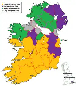 ![]() Counties coloured by 2012 Championship tier; Lory Meagher Cup counties in grey. | |||