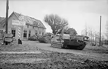 The strategic requirement now was to clear the Scheldt Estuary and get the port of Antwerp into use as an Allied supply base.[4] The 49th (West Riding) Division was to attack towards Loenhout and then unleash a mobile force to exploit the breakthrough and move up the main road to Wuustwezel in Operation Rebound. This mobile force was commanded by Brigadier W. S. Clarke of 34th Tank Brigade and named 'Clarkeforce'.[5] Controlled by 3the 4th Tank Bde HQ, Clarkeforce consisted of Churchill tanks of 107th Regiment Royal Armoured Corps, with C Squadron carrying infantry of D Company, 1st Battalion, Leicestershire Regiment, accompanied by a troop of Achilles self-propelled 17-pounders from 248 Bty, 62nd (6th London) Anti-Tank Regiment, Royal Artillery, a troop of Churchill Crocodile flame-throwing tanks of the 1st Fife and Forfar Yeomanry and two sections of Royal Engineers. The field artillery support was provided by the 25-pounder field guns of 191st (Hertfordshire and Essex Yeomanry) Field Regiment, Royal Artillery.[6][7][8]