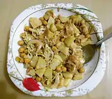 Alu chat is mainly a street food. It can be served as a snack, a side dish or a light meal.[1] It is made from boiled and fried cubed potatoes served with chat masala. It is a versatile dish that has many regional variations.[2] The word alu means potatoes in Hindi and the word chat is derived from Hindi word chatna which means tasting. Thus, alu chat means a savory potato snack.