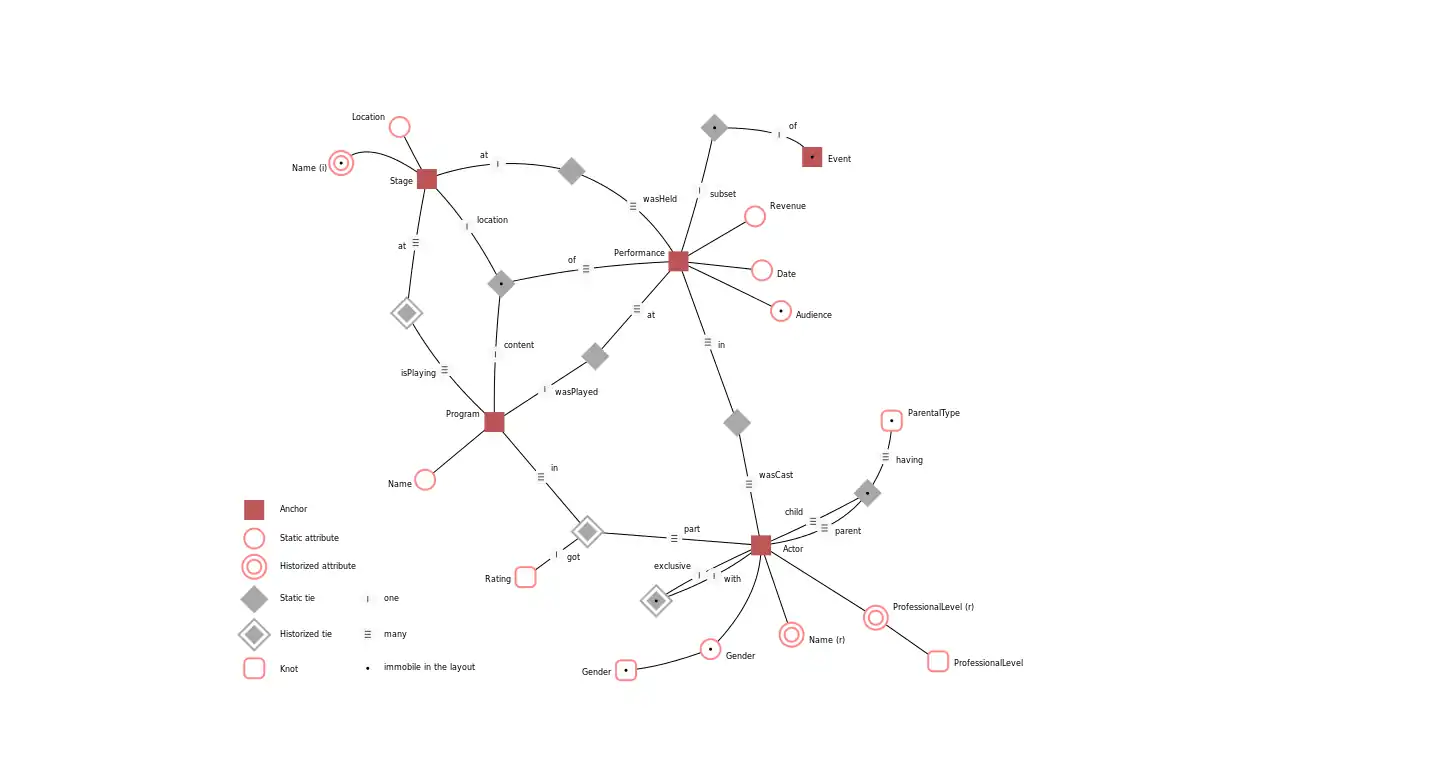 An example model showing the different graphical symbols for all the concepts can be seen below. The symbols resemble those used in entity–relationship modeling, with a couple of extensions. A double outline on an attribute or tie indicates that a history of changes is kept. The knot symbol (an outlined square with rounded edges) is also available, but knots cannot be historized. The anchor symbol is a solid square.
