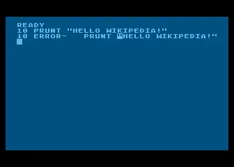 Atari BASIC's editor catches many errors that would not be noticed in MS-derived versions. If an error is found, the editor re-displays the line, highlighting the text near the error in inverse video. Errors are displayed as numeric codes, with the descriptions printed in the manual.[20] Because of the way the line editor works, the user can immediately fix the error. In the example pictured above (with PRUNT), the error can be fixed by moving the cursor over the U, typing I (the editor only has an overwrite mode), and hitting RETURN.