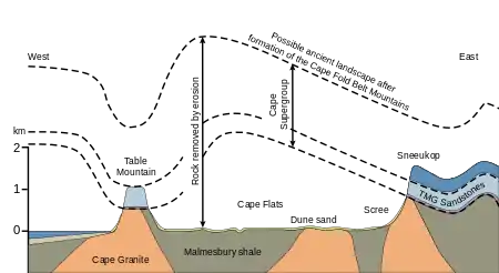 The sedimentary rocks of the Cape Supergroup, of which parts of the Graafwater and Peninsula Formations remain, were uplifted between 280 and 21S million years ago, and were largely eroded away during the Mesozoic. The region was geologically stable during the Tertiary, which has led to slow denudation of the durable sandstones. Erosion rate and drainage has been influenced by fault lines and fractures, leaving remnant steep-sided massifs like Table Mountain surrounded by flatter slopes of deposits of the eroded material overlaying the older rocks,[3]