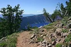 The Watchman Peak trail begins from the Watchman Overlook parking lot, about 3.8 mi (6.1 km) northwest of Rim Village.[21] The trail is 0.8 mi (1.3 km) long with a 420-foot (130 m) elevation change.[22] It is a steady uphill trail on an isolated mountain on the west rim of the crater, with several switchbacks, providing wide views of Crater Lake and Wizard Island. Several nearby landmarks are visible from the summit, including Mount McLoughlin, Mount Thielsen, Union Peak, Mount Scott and the Klamath Basin. The trail ends next to a historic fire lookout tower built in 1932.[21]