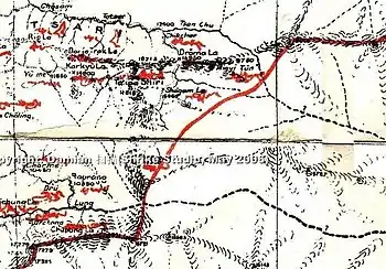 In order to induce the Assam Himalayan tribes (Tagin tribe) to allow unmolested passage to the pilgrims, the Tibetan government use to give lavish presents to them.[14] Before the annexation of Tibet by China, Longju was outside of Tibet, it was south of the Tibetan frontier town of Migyitun, along the Tsari Chu river valley. The area was historically populated by the Mara clan of the Tagin tribe of Arunachal Pradesh.[18] The border between Tibet and tribal territory was at the Mandala Plain just outside the town of Migyitun.[19] There was a crossing on the river from its left bank to the right bank near Longju,[20] which was needed to enter the Tagir tribal territory from the Tibetan. When Bailey and Morshead visited the area in 1905, they found the bridge broken. The Tibetans were unable to repair it because it was built using the tribal materials and techniques. Evidently the Tibetan authority stopped at Migyitun.[21][22]
