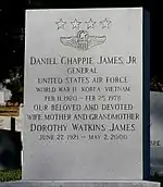 He was survived by his wife, Dorothy Watkins James, their daughter, Danice Berry, and two sons, Daniel James III and Claude James.[3] His wife Dorothy died in 2000 and is buried with him in Arlington.
