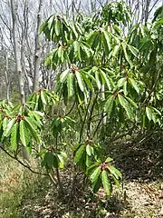 Daphniphyllum macropodum is a small tree or shrub, usually 3–10 m (10–33 ft) tall, but occasionally up to 20 m (66 ft) tall. It has long leaves, 14–25 cm (6–10 in) long by 3–6.5 cm (1–3 in) wide, with purplish red stalks (petioles) and conspicuous veins. The leaves are arranged in a tight spiral, almost like whorls at the branch tips. Very young branches are red, turning brown with age; older trunks are greyish brown.[1][4]