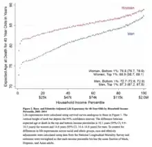 East Oakland experiences a lower life expectancy, relative to nearby neighborhoods like Alameda County, approximating 72 years. Amongst the heavily populated races present within Oakland, Hispanics lead in life expectancy, averaging 82 years. African Americans and Whites typically average 67–68 years within Oakland, while Asians live nearly 78 years. Conversely, there is a high all-cause mortality rate amongst the East Oakland community, leading in cancer, stroke, heart disease, and homicide death rates.[21] It is found that communities and families of lower socioeconomic status typically experience higher mortality rates and lower survival rates compared to those from higher socioeconomic status.[22]