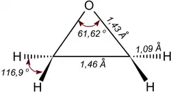 The epoxy cycle of ethylene oxide is an almost regular triangle with bond angles of about 60° and a significant angular strain corresponding to the energy of 105 kJ/mol.[22][23] For comparison, in alcohols the C–O–H angle is about 110°; in ethers, the C–O–C angle is 120°. The moment of inertia about each of the principal axes are IA = 32.921×10−40 g·cm2, IB = 37.926×10−40 g·cm2 and IC = 59.510×10−40 g·cm2.[24]