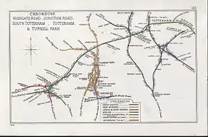 The Great Eastern attempted to obtain a West End terminus, alongside the one in east London, via the Tottenham and Hampstead Junction Railway, formed by an Act of Parliament of 28 July 1862.[19] Plans to extend the western end of this line via a proposed 'London Main Trunk Railway', underneath Hampstead Road, the Metropolitan Railway (modern Circle line) and Tottenham Court Road, to Charing Cross, were rejected by Parliament in 1864.[20]