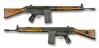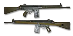 The Heckler & Koch G3 (Gewehr 3) is a 7.62×51mm NATO, select-fire battle rifle developed in the 1950s by the German armament manufacturer Heckler & Koch (HK) in collaboration with the Spanish state-owned design and development agency Centro de Estudios Técnicos de Materiales Especiales (CETME).[2] The modular designed G3 has over the years been exported to over 70 countries and manufactured under licence in at least 15 countries, bringing the total number built to around 7,800,000.[3]