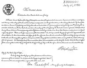 - 1790 – First US Patent Act drafted in the US Constitution. The first US Patent, numbered X000001 (pictured right), was granted on July 31, 1790. The patent was granted by President George Washington. The patent was granted to Samuel Hopkins, in Pittsford, Vermont, for the "making of pot ash and pearl ash by a new apparatus and process".[29][30]