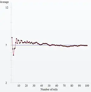 According to the law of large numbers, if a large number of six-sided dice are rolled, the average of their values (sometimes called the sample mean) will approach 3.5, with the precision increasing as more dice are rolled.