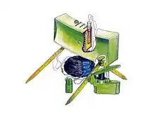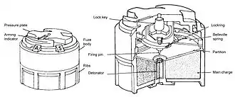 An M14 mine, showing a cutaway view. The absence of a safety clip and the location of the arrow on the pressure plate clearly shows that this mine has been armed.
