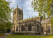 Loughborough (/ˈlʌfbərə/ ⓘ[1] LUF-bə-rə) is a market town in the Charnwood Borough of Leicestershire, England, the seat of Charnwood Borough Council, and the location of Loughborough University. At the 2021 census the town's built-up area had a population of 64,884,[2] the second largest in the county after Leicester. Loughborough is close to the Nottinghamshire border and short distances from Leicester, Nottingham, East Midlands Airport, and Derby. It has the world's largest bell foundry, John Taylor Bellfounders, which produced Great Paul at St Paul's Cathedral, as well as making bells for the Carillon War Memorial, a landmark in the Queens Park in the town, and for York Minster.