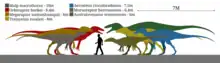 Megaraptorans were medium to large-sized theropods, ranging from Fukuiraptor, which was about 4.2 meters (13.8 feet) in length, to the 9 meter (30 feet) long Aerosteon, the 9 to 10 meter (30 to 33 feet) long Maip and the 12.8 meter (42 foot) long Bahariasaurus, if it is a member.[2] Most megaraptorans are known from very fragmentary remains, although certain characteristics can be identified in multiple members of the clade. At least some megaraptorans, such as Murusraptor and Aerosteon, had extensively pneumatic bones (most noticeably the ilia and ribs), which likely housed sinuses connected to the lungs, similar to modern birds.[13] The slender leg bones and long metatarsals of several species indicate that members of this group likely had cursorial habits.[9] Most megaraptorans are part of the family Megaraptoridae, which was named by Fernando Novas and his colleagues in 2013. This family is united by several adaptations of the ulna and claws which are not present in the basal megaraptoran Fukuiraptor.[7]