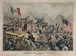 During the Battle of Resaca de la Palma on May 9, 1846, the two sides engaged in fierce hand-to-hand combat. The U.S. Cavalry managed to capture the Mexican artillery, causing the Mexican side to retreat—a retreat that turned into a rout.[80] Fighting on unfamiliar terrain, his troops fleeing in retreat, Arista found it impossible to rally his forces. Mexican casualties were significant, and the Mexicans were forced to abandon their artillery and baggage. Fort Brown inflicted additional casualties as the withdrawing troops passed by the fort, and additional Mexican soldiers drowned trying to swim across the Rio Grande.[84] Taylor crossed the Rio Grande and began his series of battles in Mexican territory.