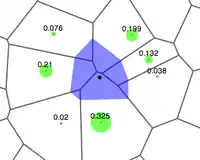 where is the estimate at , are the weights and are the known data at . The weights, , are calculated by finding how much of each of the surrounding areas is "stolen" when inserting into the tessellation.