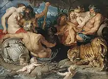 His biblical and mythological nudes are especially well-known. Painted in the Baroque tradition of depicting women as soft-bodied, passive, and to the modern eye highly sexualized beings, his nudes emphasize the concepts of fertility, desire, physical beauty, temptation, and virtue. Skillfully rendered, these paintings of nude women are thought by feminists to have been created to sexually appeal to his largely male audience of patrons,[38] although the female nude as an example of beauty has been a traditional motif in European art for centuries. Additionally, Rubens was quite fond of painting full-figured women, giving rise to terms like 'Rubensian' or 'Rubenesque' (sometimes 'Rubensesque'). His large-scale cycle representing Marie de Medicis focuses on several classic female archetypes like the virgin, consort, wife, widow, and diplomatic regent.[39] The inclusion of this iconography in his female portraits, along with his art depicting noblewomen of the day, serve to elevate his female portrait sitters to the status and importance of his male portrait sitters.[39]