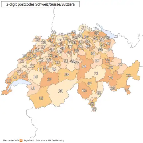 Switzerland is divided into nine postal districts, numbered from west to east. Each district is subdivided into postal areas. Each area contains a maximum of one hundred units.