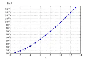 For the nth prime number pn, the primorial pn# is defined as the product of the first n primes:[1][2]