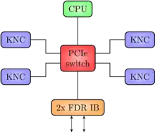 The low-power Intel E3-1230L v3 server CPU is energy-efficient, but weak in computational power compared to other server processors available around 2015 (and in particular weaker than most accelerator cards). The CPU does not contribute significantly to the compute power of the node. It is merely running the operating system and system-relevant drivers. Technically, the CPU serves as a root complex for the PCIe fabric. The PCIe switch extends the host CPU's limited number of PCIe lanes to a total of 80 lanes, therefore enabling a multitude of components (4x Xeon Phi and 1x InfiniBand, each x16 PCIe) to be connected to the CPU as PCIe endpoints. This architecture also allows the Xeon Phis to do peer-to-peer communication via PCIe and to directly access the external network without having to go through the host CPU.