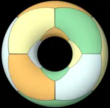 Regular maps exist as torohedral polyhedra as finite portions of Euclidean tilings, wrapped onto the surface of a duocylinder as a flat torus. These are labeled {4,4}b,c for those related to the square tiling, {4,4}.[4] {3,6}b,c are related to the triangular tiling, {3,6}, and {6,3}b,c related to the hexagonal tiling, {6,3}. b and c are whole numbers.[5] There are 2 special cases (b,0) and (b,b) with reflective symmetry, while the general cases exist in chiral pairs (b,c) and (c,b).