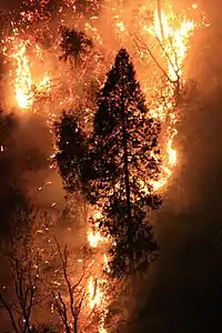 The United States Forest Service made it their highest priority fire at the time because of the threat to local communities and its proximity to Yosemite National Park.[44] Though giant sequoia trees—some of the biggest and oldest living things on Earth—are very fire-tolerant and need fire to reproduce, concerns rose as the fire approached them.[45] Park officials set sprinklers to help protect nearby sequoia trees,[46] but the sprinklers were later removed and careful low-intensity prescribed burns were used.[47] Parts of the National Forest are used for grazing, and the blaze impacted 6 of 14 grazing allotments located within the fire perimeter where displaced cattle were scattered over a wide area.[48] Smoke from the fire caused unhealthy air conditions in Reno, Nevada, and the Lake Tahoe area during the first week of the fire, forcing the cancellation of several outdoor events.[49] School children were sent home due to smoky conditions as well. From Yosemite to the San Joaquin Valley, air quality reached unhealthy levels several times according to the National Weather Service. Berkeley Tuolumne Camp, a family camp operated by the city of Berkeley, established in 1922, was burned to the ground.[50] Nearby Camp Tawonga suffered some damage, including the loss of three buildings.[50][51] Camp Mather, operated by the city of San Francisco, suffered minor damage,[52] as did the San Jose Camp run by the city of San Jose.[53] During Labor Day weekend, parts of Yosemite National Park filled with thick smoke, pushing air quality indices to unhealthy levels and obscuring views.[54]