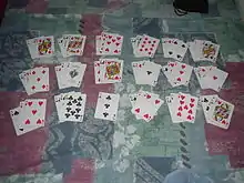 The game is layout out as in La Belle Lucie: seventeen piles of three cards are placed on the table with one card counting as an eighteenth.[3] Any card that can be moved to the foundations should be moved and built up by suit (starting from the ace). The top card of each pile can be used for play and once a pile is empty, it cannot be refilled.