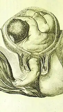 In 1690 Justine Siegemundin, a German midwife, published Die Kgl. Preußische und Chur-Brandenburgische Hof-Wehemutter. This treatise for midwives demonstrated abnormal presentations at birth and their management. She was the first to describe a two-handed method of performing an internal rotation of the baby to extract it as a breech (a variation of which is performed today on the second twin, see above) using a sling.[6] The procedure was useful provided the fetus was not impacted. Once the uterus had contracted around the baby tightly, destructive interventions were used to save the life of the mother.[7]