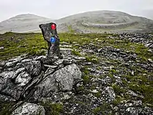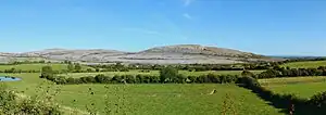 The Burren (/ˈbʌrən/ BURR-ən; Irish: Boirinn, meaning 'rocky district')[1] is a karst/glaciokarst landscape centred in County Clare, on the west coast of Ireland.[2] It measures around 530 square kilometres (200 sq mi), within the circle made by the villages of Lisdoonvarna, Corofin, Gort and Kinvara.[3] The area includes such natural features as Mullaghmore hill and Ailladie cliffs, and historic monuments such as Poulnabrone dolmen and Caherconnell Stone Fort. The Burren National Park covers a small part of the Burren and is the smallest of the six National Parks in Ireland, while the adjacent territory, including the Cliffs of Moher, is included in the Burren and Cliffs of Moher Geopark.