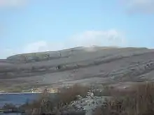 The area is formed from a thick succession of sedimentary rocks, largely limestones but also including sandstones, mudstones and siltstones. All of the solid rocks exposed at the surface are of Carboniferous age though they are underlain at depth by Old Red Sandstone of Devonian age which in turn overlies rocks of Lower Palaeozoic age. None of the pre-Carboniferous rocks is seen at the surface in the area.[9] The limestones, which date from the Visean stage of the early Carboniferous, formed as sediments in a tropical sea approximately 325 million years ago. The strata contain fossil corals, crinoids, sea urchins and ammonites. This bed of limestone is up to 800 metres thick. In the north and west it lies on a shelf of Galway granite which supported the upper layers, preventing shifts like those that created the "twisted" hills Knockanes and Mullaghmore. The limestone also extends below Galway Bay out to the Aran Islands and to the east into the Gort plain.[4]:16,33