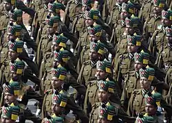 The present uniform of the Madras Regiment includes a green lanyard on the left shoulder and the shoulder title Madras (brass / green letters over scarlet background). The green beret (common to all infantry units in India) has the regimental crest on a scarlet diamond base stitched to the beret and a black pom pom. The latter, a black woollen ball, is unique to the Regiment and it gives a distinct identification. It was adopted on 07 January 1949 following a proposal by the then Commanding Officer of 4 Madras (WLI) - Lieutenant Colonel MK Sheriff.[17] The regimental turban is worn by personnel during ceremonial occasions, parades, on guard duty and by those in the regimental band. It was adopted in November 1979 and consists of a dark green background with yellow, scarlet and white stripes. On the left of the wearer is a yellow silken jhallar with the same stripes. On the front top is a black pom pom and below is the regimental crest on a scarlet background.[18]