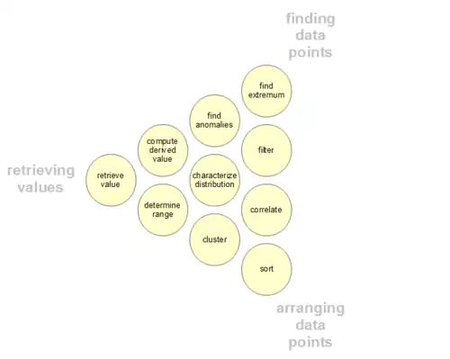 Users may have particular data points of interest within a data set, as opposed to the general messaging outlined above. Such low-level user analytic activities are presented in the following table. The taxonomy can also be organized by three poles of activities: retrieving values, finding data points, and arranging data points.[44][45][46]