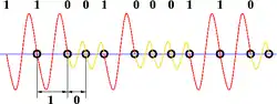 To record physical data, the zero-crossing from positive to negative voltage of the analog signal is measured. The resulting time between these positive to negative crossings is then compared to a threshold to determine whether the time since the last crossing is short (0) or long (1).[10] Note the lower amplitude for the shorter periods.