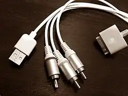 | Apple Composite AV Cable | Allows the iPad or iPad 2 to be connected to any TV or home cinema system to allow Movies and other videos to be watched in stereo sound only on a TV from the iPad or iPad 2. This is achieved by plugging the wires into the composite video and audio plugs in a TV or home cinema system and into the 30-pin connector on the iPad or iPad 2. However, it will not mirror the display. | [9] | ||