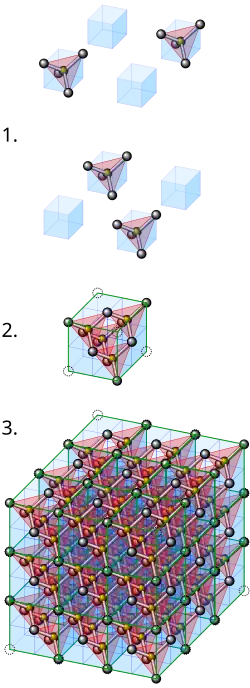 The cubical cells to be meshed can also be sliced into 5 tetrahedra,[3] using a (diamond cubic) lattice as a basis. Cubes are mated on each side with another that has an opposite alignment of the tetrahedron around the centroid of the cube. Alternating vertices have a different number of tetrahedra intersecting on it, resulting in a slightly different mesh depending on position. When sliced this way, additional planes of symmetry are provided; having a tetrahedron around the centroid of the cube also generates very open spaces around points that are outside of the surface.