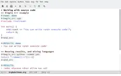 Almost orthogonally, Org Mode has functionalities aimed at executing code in various external languages; these functionalities form org-babel.[9][10]