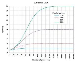 The maximum potential speedup of an overall system can be calculated by Amdahl's law.[14] Amdahl's Law indicates that optimal performance improvement is achieved by balancing enhancements to both parallelizable and non-parallelizable components of a task. Furthermore, it reveals that increasing the number of processors yields diminishing returns, with negligible speedup gains beyond a certain point. [15][16]
