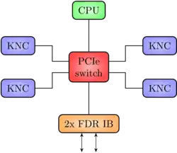 The low-power Intel E3-1230L v3 server CPU is energy-efficient, but weak in computational power compared to other server processors available around 2015 (and in particular weaker than most accelerator cards). The CPU does not contribute significantly to the compute power of the node. It is merely running the operating system and system-relevant drivers. Technically, the CPU serves as a root complex for the PCIe fabric. The PCIe switch extends the host CPU's limited number of PCIe lanes to a total of 80 lanes, therefore enabling a multitude of components (4x Xeon Phi and 1x InfiniBand, each x16 PCIe) to be connected to the CPU as PCIe endpoints. This architecture also allows the Xeon Phis to do peer-to-peer communication via PCIe and to directly access the external network without having to go through the host CPU.