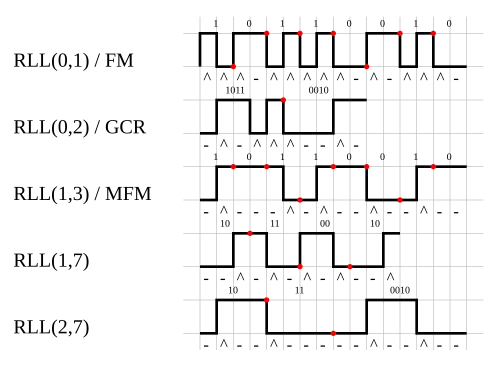To prevent this problem, data is coded in such a way that long repetitions of a single binary value do not occur. By limiting the number of zeros written consecutively to some maximum k, this makes it possible for the drive controller to stay synchronized. By limiting the number of zeros written in a row to some minimum d between each and every one, the overall frequency of polarity changes is reduced, allowing the drive to store more data in the same amount of space, resulting in either a smaller package for the same amount of data or more storage in the same size package.