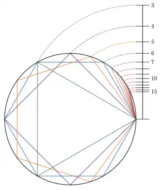 The polygraphic lines, innermost scale on the back of the instrument, is labelled from 3 to 15, and the distance from the pivot is inversely proportional to the side length of a regular polygon of sides inscribed in a given circle, or directly proportional to the circumradius of a regular polygon of sides of a given length. If is the length on the polygraphic scale and represents the trigonometric chord length of a circular arc measured in degrees, then