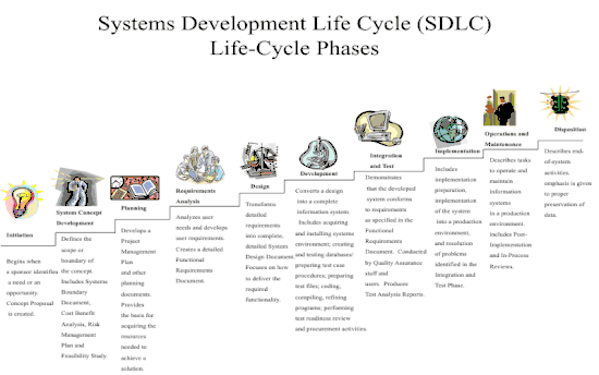 SDLC phase objectives are described in this section with key deliverables, a description of recommended tasks, and a summary of related control objectives for effective management. It is critical for the project manager to establish and monitor control objectives while executing projects. Control objectives are clear statements of the desired result or purpose and should be defined and monitored throughout a project. Control objectives can be grouped into major categories (domains), and relate to the SDLC phases as shown in the figure.[22]