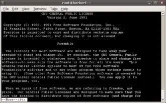 A terminal pager, paging program or simply pager is a computer program used to view (but not modify) the contents of a text file moving down the file one line or one screen at a time. Some, but not all, pagers allow movement up a file.[1] A popular cross-platform terminal pager is more, which can move forwards and backwards in text files but cannot move backwards in pipes.[2] less is a more advanced pager that allows movement forward and backward, and contains extra functions such as search.[3]