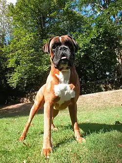 A guard dog, sometimes called an attack dog,[lower-alpha 1] is a dog that is trained to watch for and guard against people or animals who should not be there.[3] Their main job is to keep their owner and the owner's property safe from danger. A guard dog is not the same as a "watchdog". A watchdog will let its owner know that a stranger is coming by barking. Guard dogs, however, may be trained to attack if their owner tells them to.[lower-alpha 2] A guard dog may also be trained to attack if a stranger comes too close. If trained properly, they will give a warning before attacking. A different type of guard dog is a livestock guard dog. Certain breeds of dogs are natural guardians of livestock.[5] Their job is to stay with and guard a flock or herd against predators.[5]