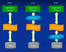 On a personal computer, the file system and storage are on the same machine (Direct Attached Storage). In Network Attached Storage, the file system and storage are on a remote server. In a Storage Area Network, the file system is on the local machine, and the storage is on a remote machine.