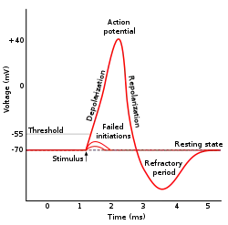 When a stimulus (chemical, mechanical or electrical) is applied to the membrane the sodium potassium pump stops working. The Na+ ions will rush inside the cell followed by the reversal of polarity of the axonal membrane. Its also called depolarisation of the nerve fibre. The electric potential difference at the site of stimulus is called the action potential (+40mV).[2]